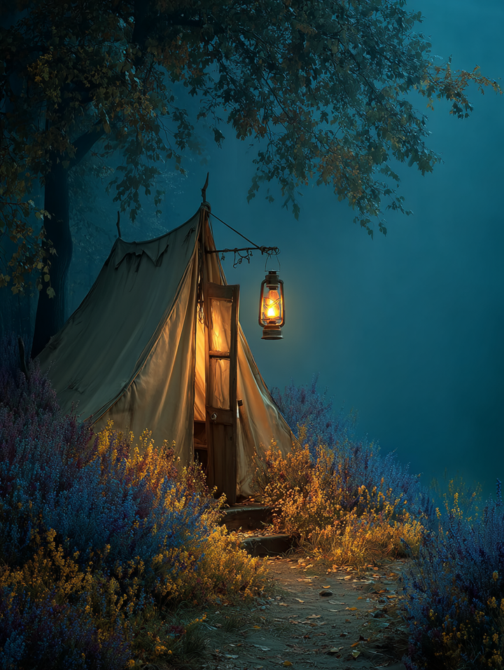 ● 🏕️ Twilight Tent Scene – Soft lantern light glows against cool forest blues.