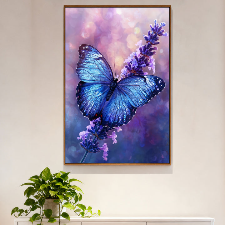 Lavender Mist Blue Butterfly captures a radiant blue butterfly resting gently on blooming lavender stems.