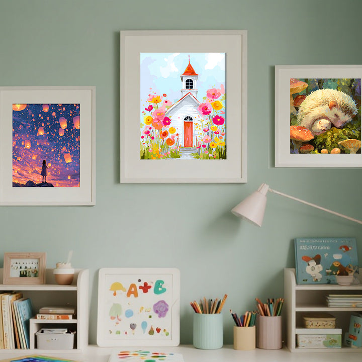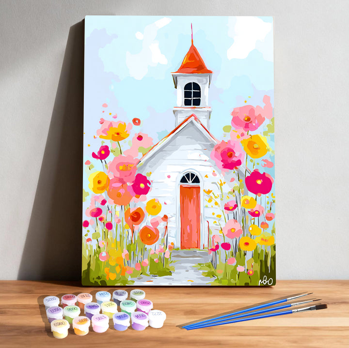 Little White Chapel in Blooming Flower Garden – Bright Spring Faith & Joyful Colors Paint by Numbers Kit | PaintEasy