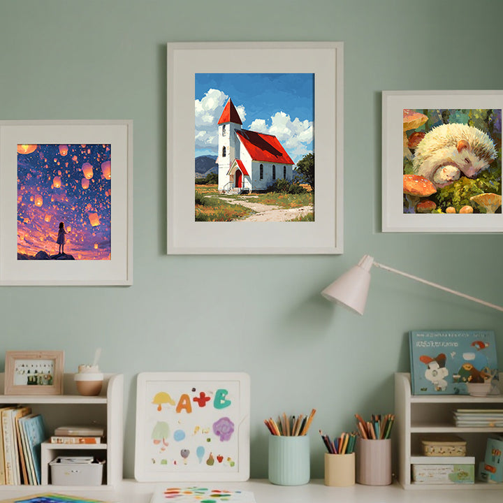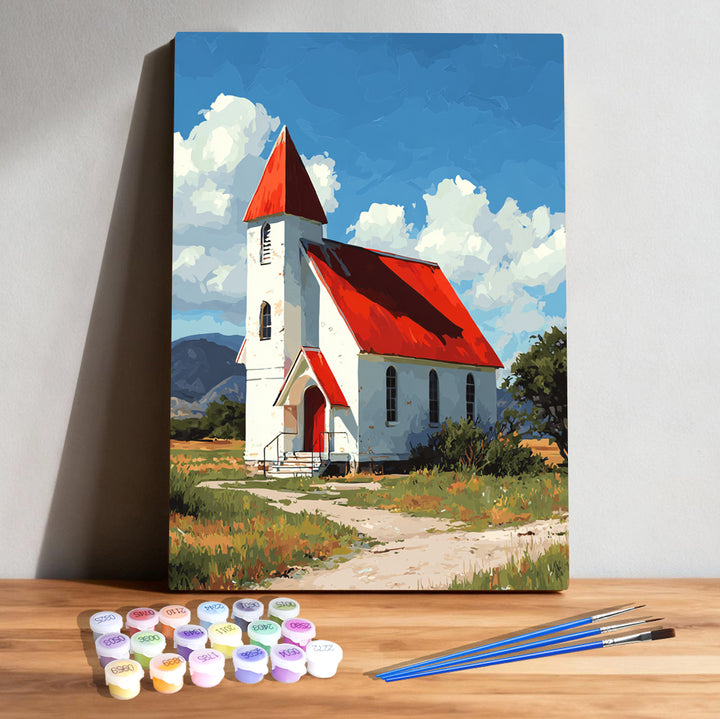 Little White Chapel with Red Roof – Countryside Faith & Sunshine Daylight Paint by Numbers Kit | PaintEasy