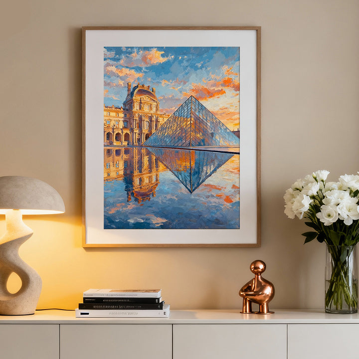 Louvre Sunset Reflections captures the Louvre Pyramid and palace bathed in warm, golden light.
