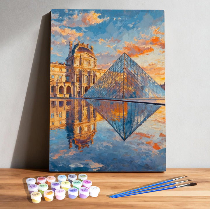 Create a masterpiece of Paris at golden hour. This Louvre-inspired paint by numbers kit features glowing sunset skies, crystal-clear pyramid reflections, and elegant historic architecture. A vivid, high-saturation design perfect for relaxing, gifting, and decorating your home.