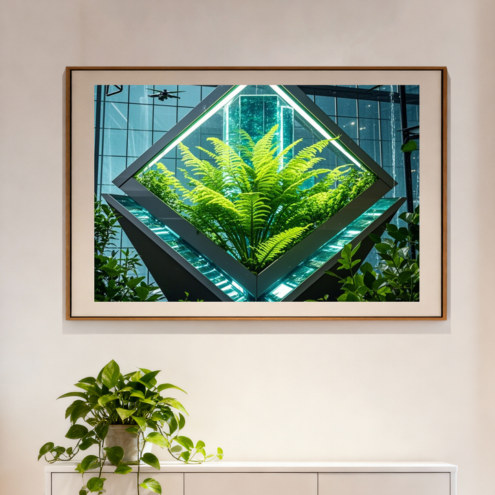 Inside a diamond-shaped terrarium, vivid green ferns breathe under cold cyan light — a microcosm of nature reborn within technology’s precision.