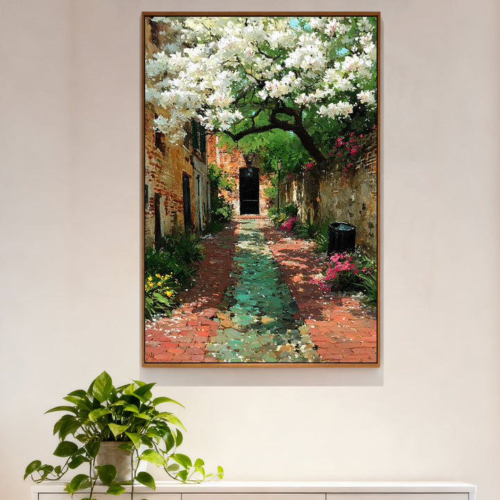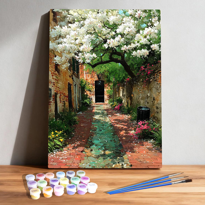 Warm walls, scattered blossoms, and dappled green shadows create a peaceful, nostalgic scene — perfect for painters who love calm spring moments.