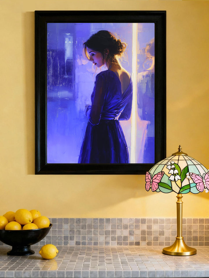 Midnight Blue Reverie captures an intimate moment—a woman standing beside a soft golden light, wrapped in deep midnight blue tones.