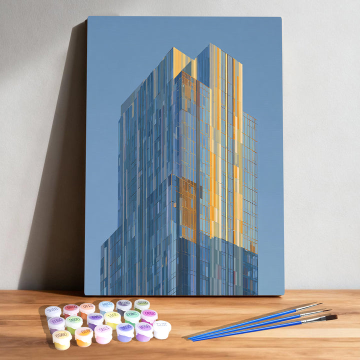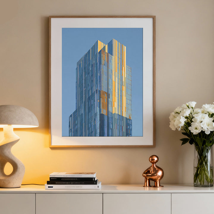 Golden Stripes Tower captures a sleek modern skyscraper washed in soft blue tones, with panels of warm sunlight running down its glass facade.