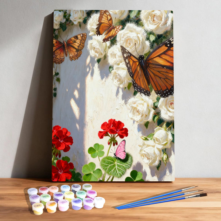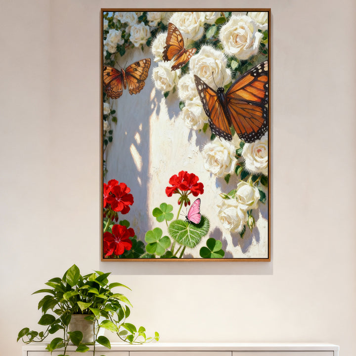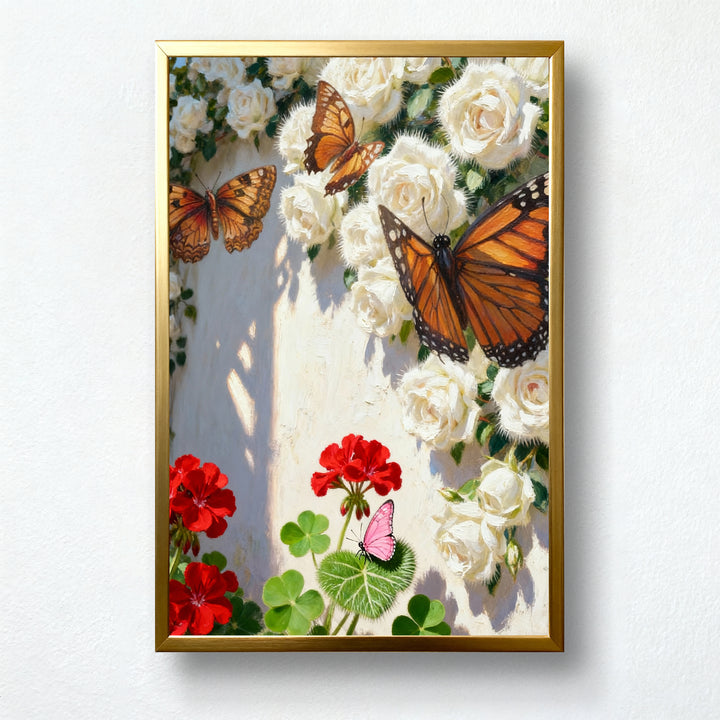 Bright red geraniums bloom below, while monarch butterflies drift lazily through the air—wings catching the sun with every beat.