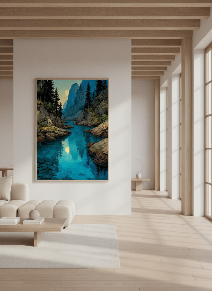 ● 🏔️ Mountain Serenity Composition – Tall pines and rugged cliffs frame the view.