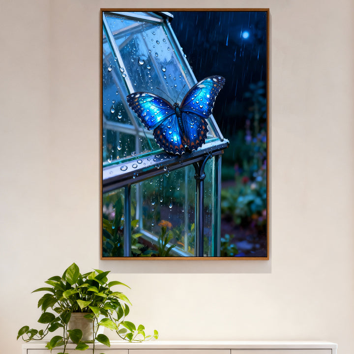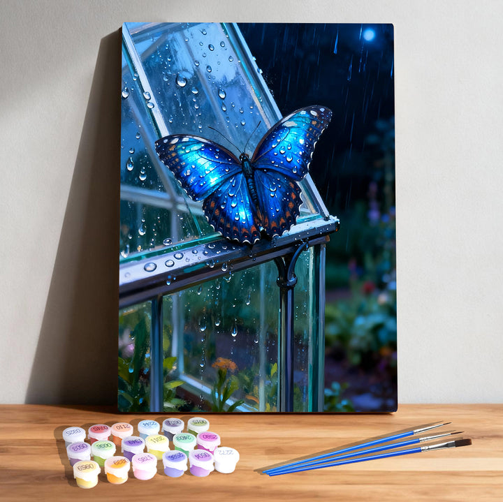 a glowing blue butterfly perched on a rain-soaked greenhouse window,