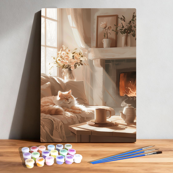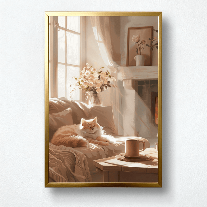 a sleepy cat by the fire, golden beams spilling through sheer curtains,
