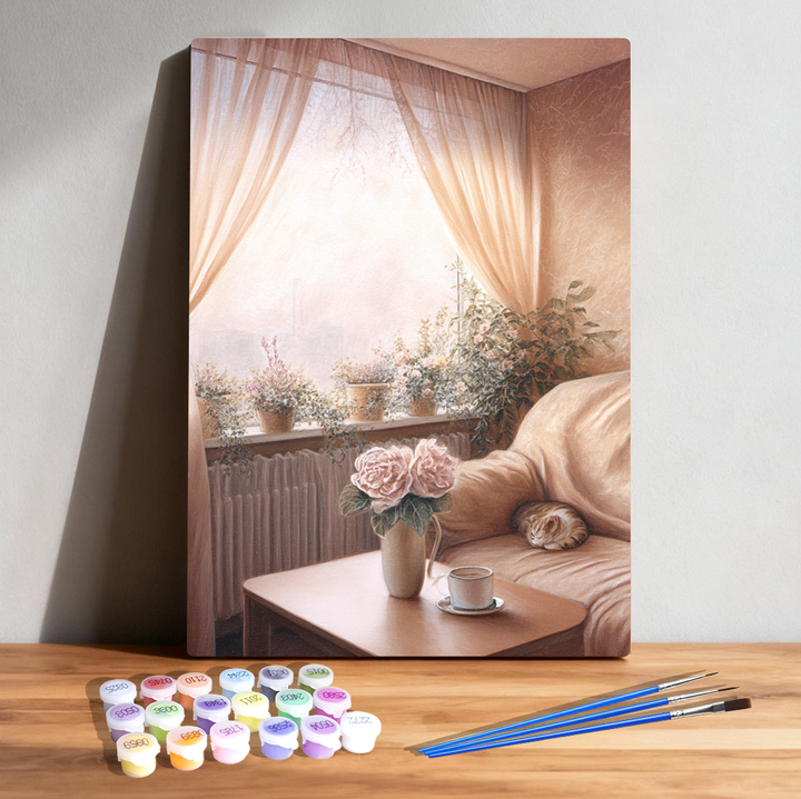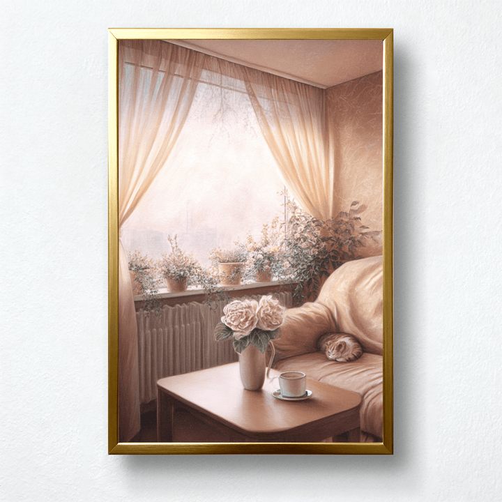 ● 🌸 Floral & Cozy Interior – Peonies, potted plants, and a serene home vibe.