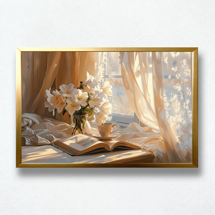 a vase of white blossoms, an open book, and a cup of tea waiting by the window.