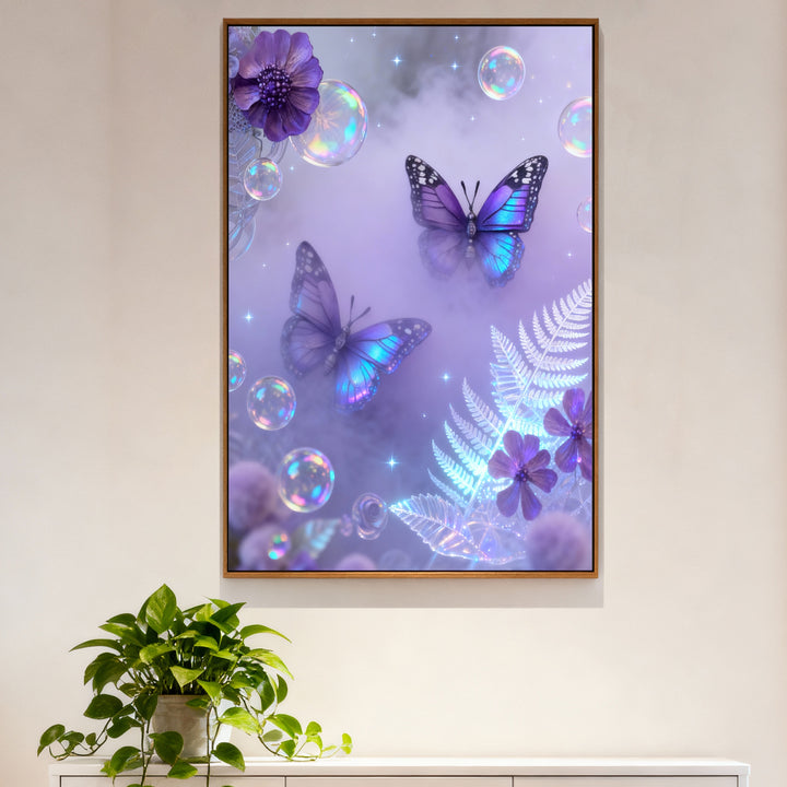 Mystic Bubble Wings invites you into a soft, enchanted dreamscape filled with iridescent bubbles, gentle purple fog, and luminous butterflies drifting through the air. Their wings glow with shades of violet and electric blue, reflecting the magical light around them. Crystal ferns, soft florals, and tiny stars complete a serene, celestial fantasy.