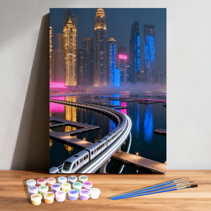 ● 🚄 Futuristic Urban Scene – Sleek train gliding through a glowing skyline over mirrored waters.