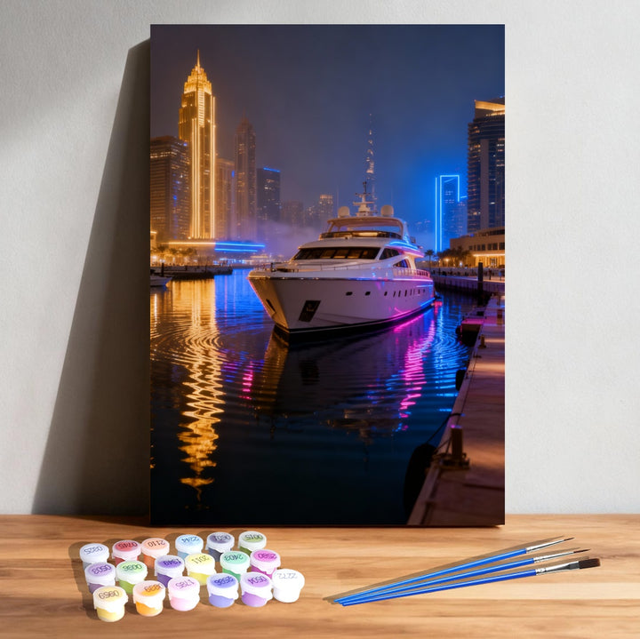 Neon Voyage captures a tranquil harbor where luxury meets serenity —