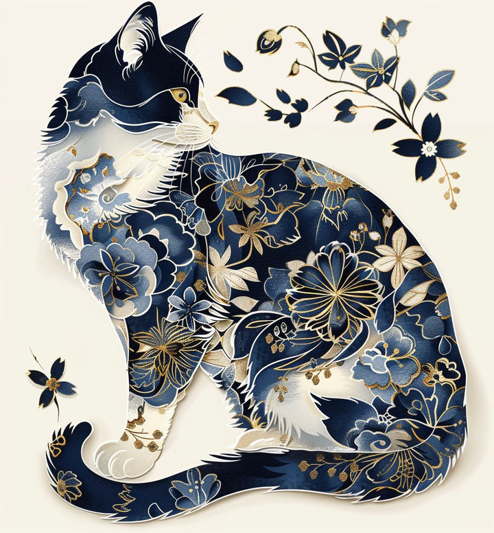 The artwork features a serene white cat covered in blooming floral motifs—combining oriental charm with modern artistry. Perfect for cat lovers, art enthusiasts, or anyone seeking a peaceful painting experience.