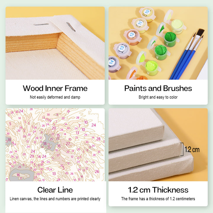 Unveil every essential neatly packed in our Paint by Numbers kit. With each component labeled and ready to use, you can focus solely on your artistic journey. From the vibrant paints to the precision brushes, we've ensured that nothing stands between you and your canvas. Suitable for both beginners and seasoned artists, this kit offers a pure, uninterrupted painting experience.