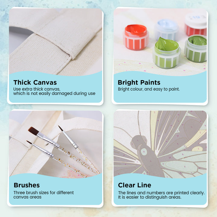 Unveil every essential neatly packed in our Paint by Numbers kit. With each component labeled and ready to use, you can focus solely on your artistic journey. From the vibrant paints to the precision brushes, we've ensured that nothing stands between you and your canvas. Suitable for both beginners and seasoned artists, this kit offers a pure, uninterrupted painting experience.