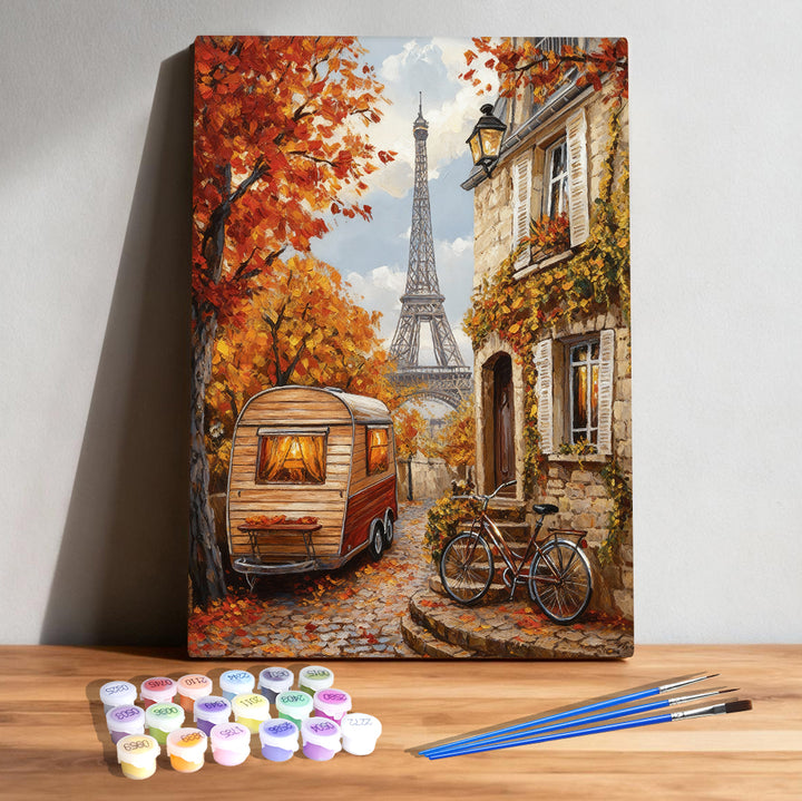 This paint-by-numbers kit captures a quiet cobblestone lane, a charming vintage caravan, and the Eiffel Tower rising gently in the distance—perfect for relaxing, gifting, and decorating your space with cozy Parisian magic.
