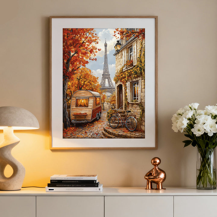 A dreamy Paris street in autumn, glowing with golden leaves, a vintage caravan, and the Eiffel Tower in soft light. Perfect for warm, romantic, travel-inspired home decor.
