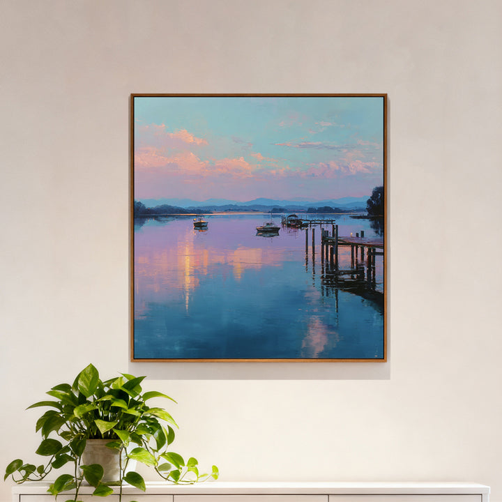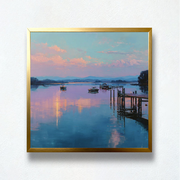 Pastel Dusk Harbor Reflections captures a dreamy lakeside evening—