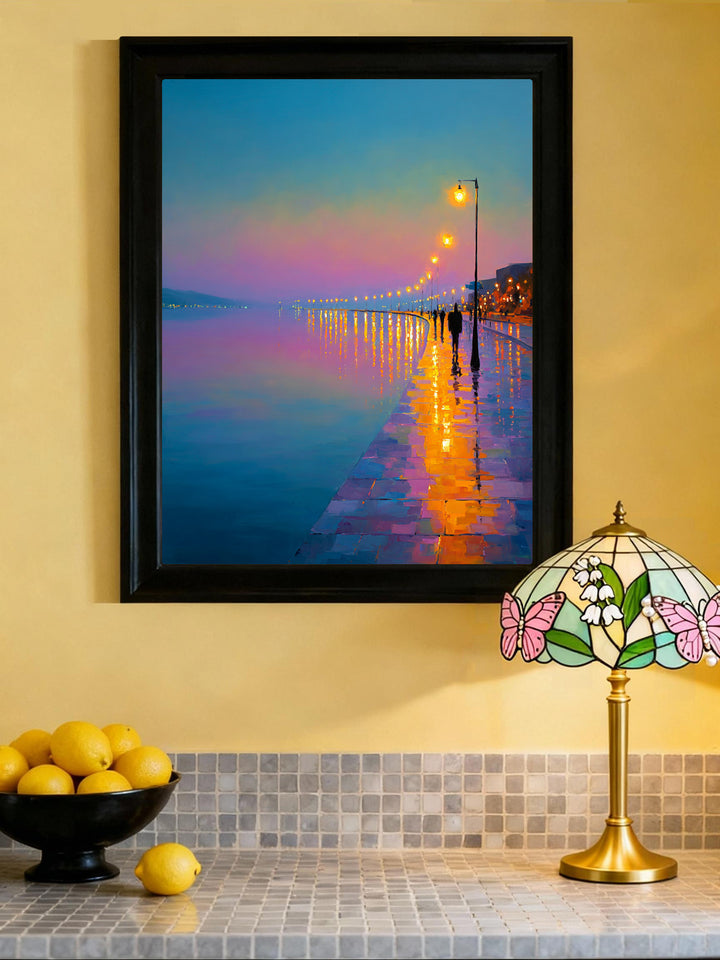 Pastel Waterfront Walkway captures a serene twilight momentāwarm streetlamps glowing in a long golden line, their reflections stretching across the glossy tiles while the sky fades through pink, lavender, and soft turquoise.