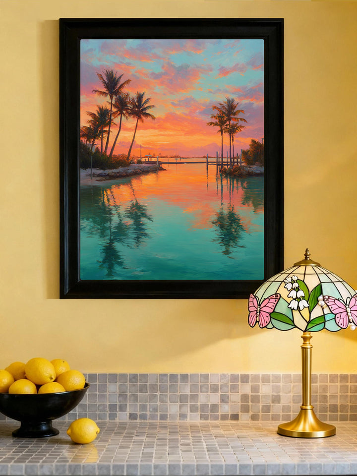 Sunset Lagoon Escape captures a peaceful tropical inlet glowing with coral skies, turquoise reflections, and gently swaying palm trees.