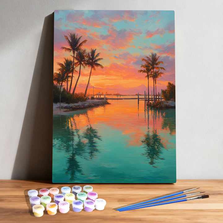 ✨ Paint a warm tropical evening where the sky glows, the palms sway, and the water rests in quiet, colorful stillness.