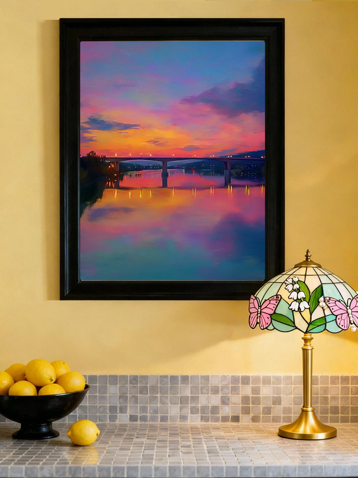 Rainbow Bridge Sunset captures a dreamy sky of pink, gold, violet, and deep blue — all glowing above a quiet river.