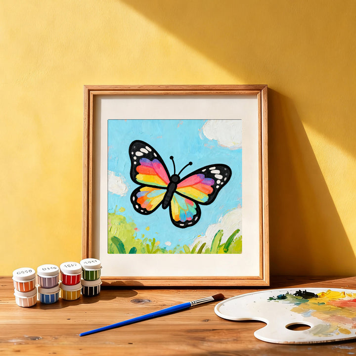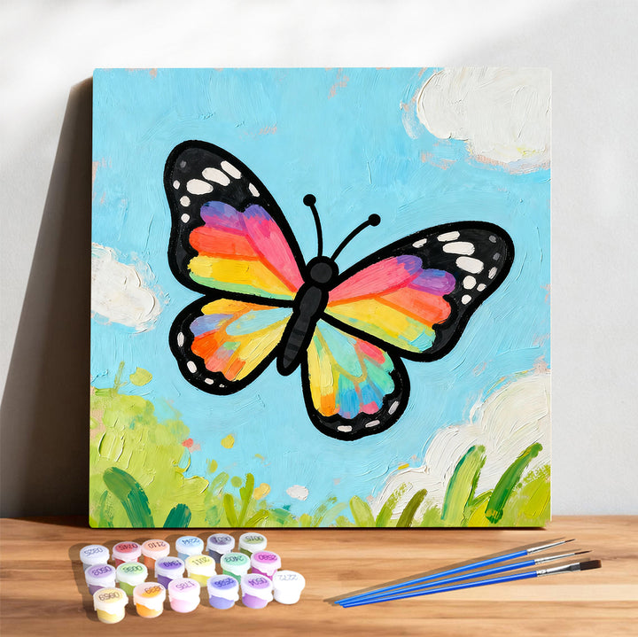Rainbow-Wing Butterfly in Sunny Sky – Playful Colors & Tiny Bush Friends Paint by Numbers Kit | PaintEasy