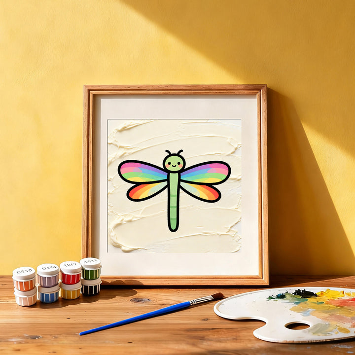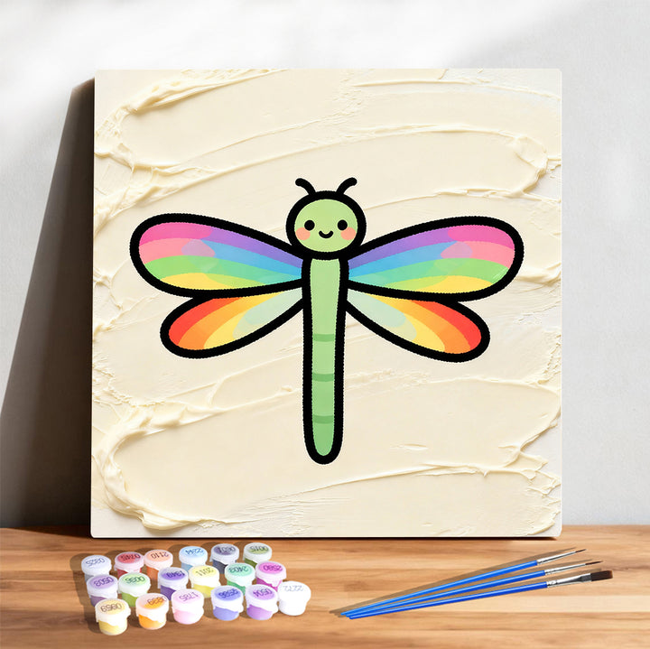 Rainbow-Wing Dragonfly on Cream Brushstrokes – Cheerful Colors & Tiny Bush Friends Paint by Numbers Kit | PaintEasy