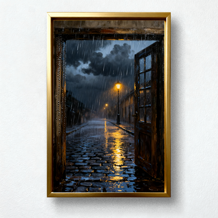 Moody Night Scene – A nostalgic alley lit by golden lamps and silver rain.