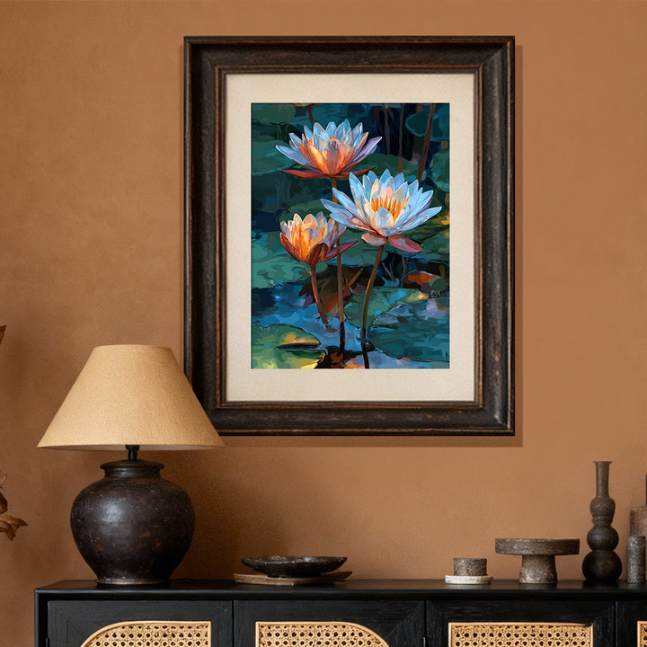 Luminous Water Lilies captures the glow of petals rising from the pond—