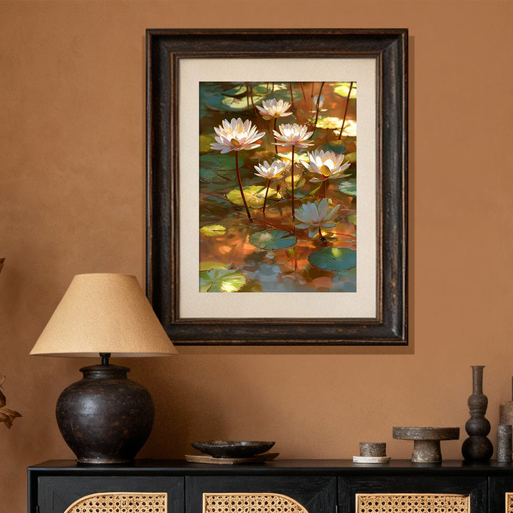 Sunlit Lotus Glow captures a quiet pond illuminated by warm afternoon light—