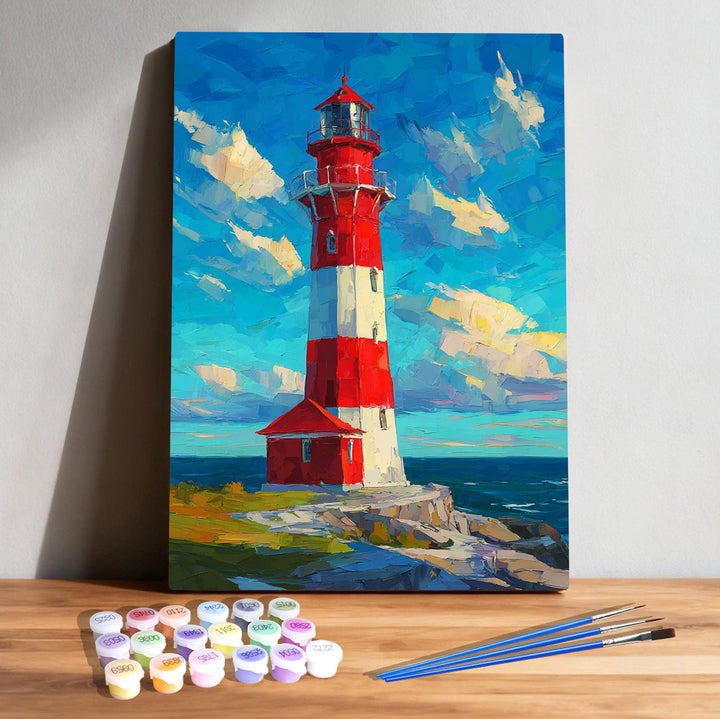 Paint a bold red-and-white coastal lighthouse under a bright blue sky. A vibrant, beginner-friendly paint-by-numbers kit perfect for décor and relaxation.