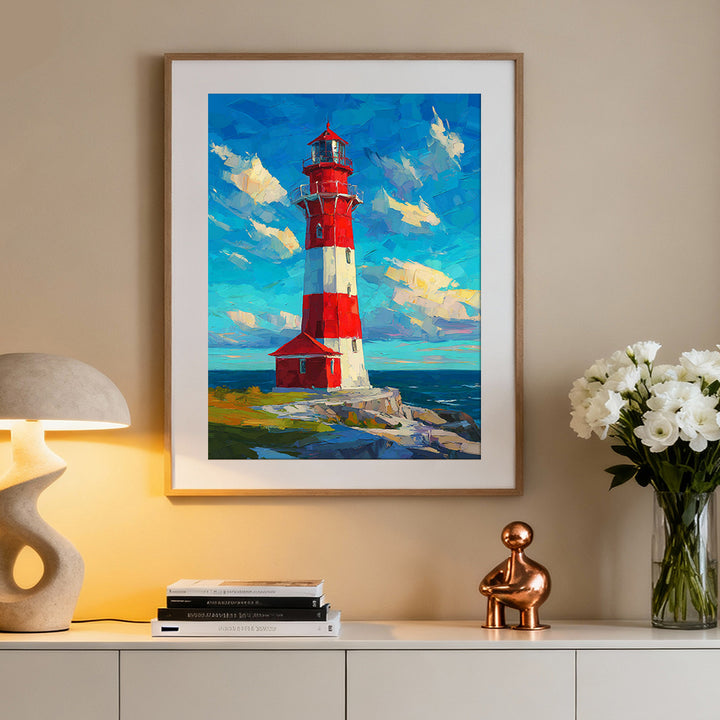 This scene features a classic striped lighthouse standing proudly on rocky cliffs, surrounded by a vivid blue sky filled with textured, windswept clouds. The striking red-and-white tower contrasts beautifully with the cool ocean tones, creating a dynamic and uplifting seascape.