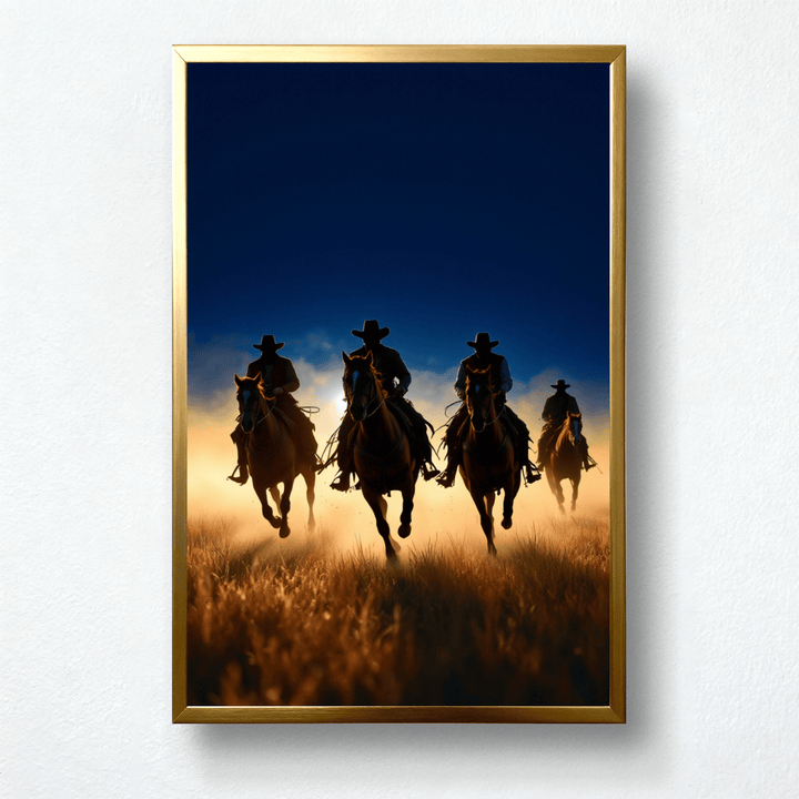 Cinematic Western Composition – Dynamic silhouettes and golden glow.