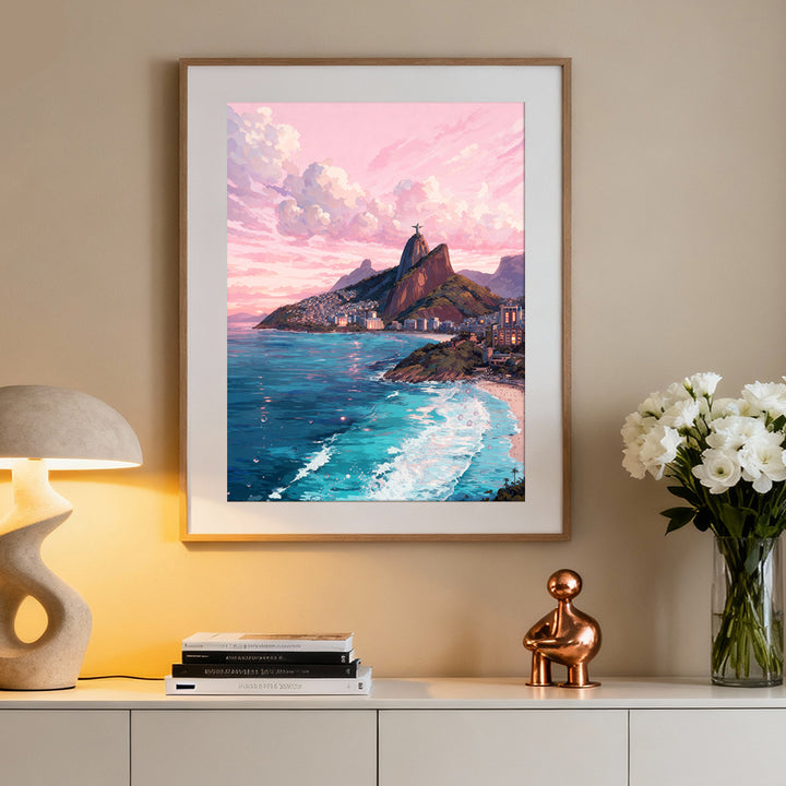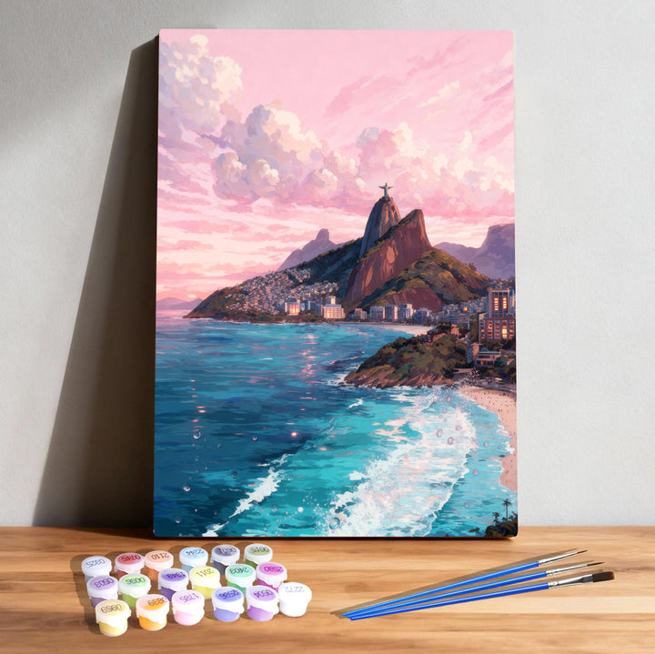 Our Rio Pink Sunset Coast Paint by Numbers kit captures Rio de Janeiro in its softest, dreamiest moment. The turquoise water curls toward the sand, pastel clouds drift across the evening sky, and the iconic Christ the Redeemer statue stands quietly above the glowing city below.
