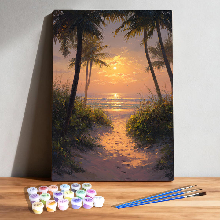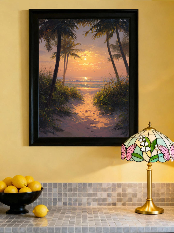 Sunlit Shore Path captures the feeling of stepping through palms and coastal greenery toward a peaceful sunset beach—soft golden light on the sand, gentle waves catching the last glow of day, and footprints leading straight into the horizon.