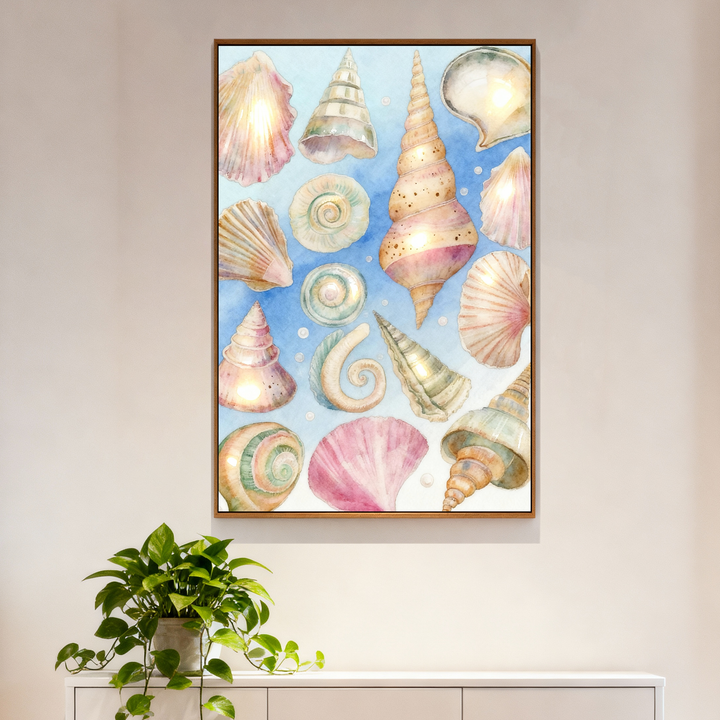 Sea Shell Harmony is a soothing seaside painting filled with soft blue, pink, and golden tones.