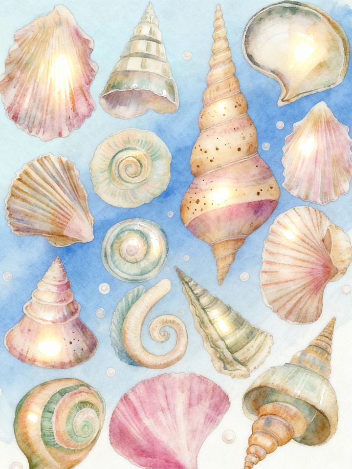 ● 🐚 Seashell Collection Design – Inspired by real ocean shells, each with unique shapes and spirals.