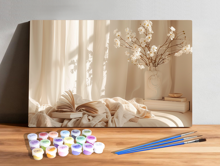 ● 🎨 Minimalist Painting Experience – A soothing palette of ivory and sand tones.