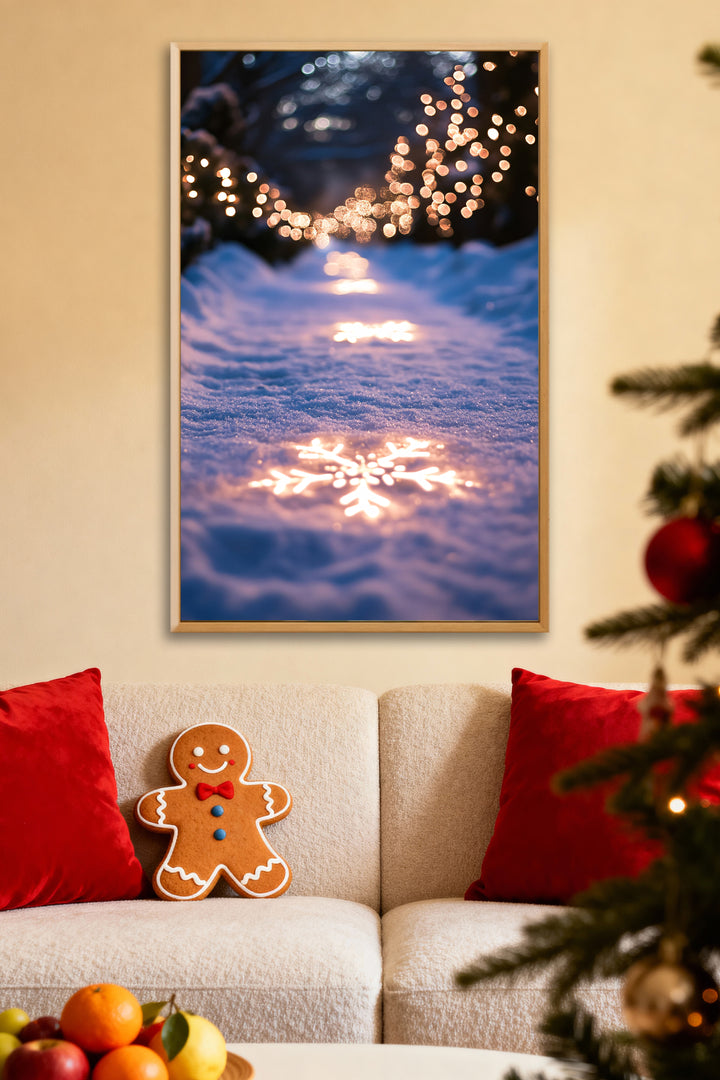 “Snowlight Path” captures the quiet magic of winter evenings — glowing snowflake lights beneath your feet, golden sparkles on trees, and the hush of falling snow.