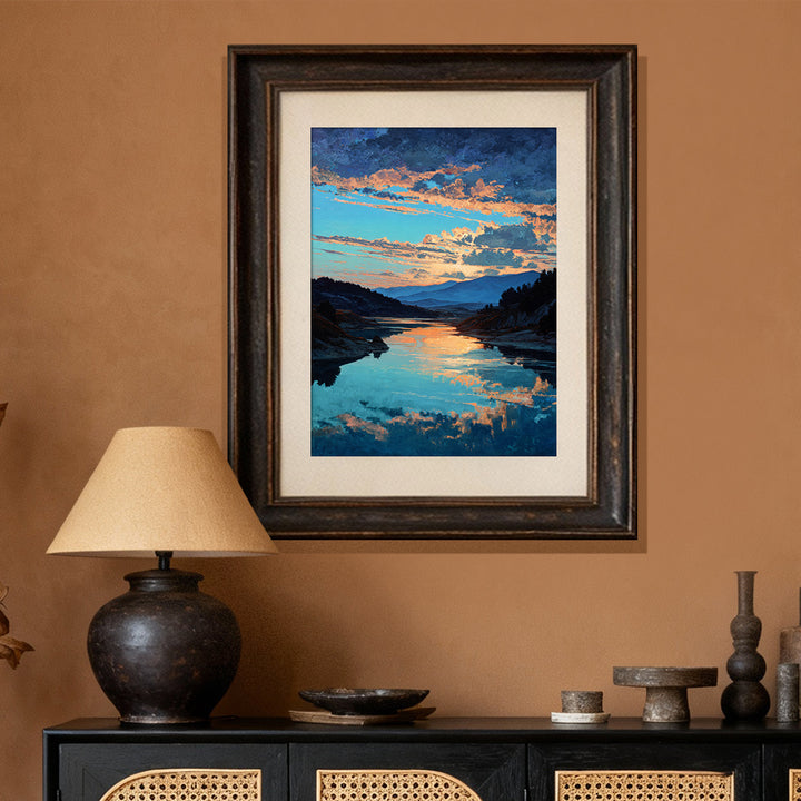 Twilight Reflections captures the breathtaking moment when the sky burns gold while the lake turns deep blue.