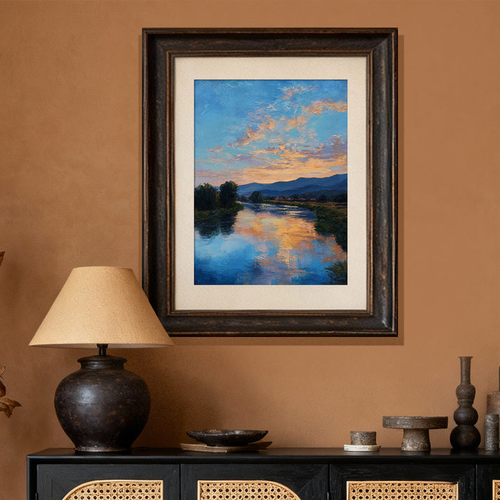 Soft River Dawn captures the quiet moment when pastel skies melt into calm blue water.