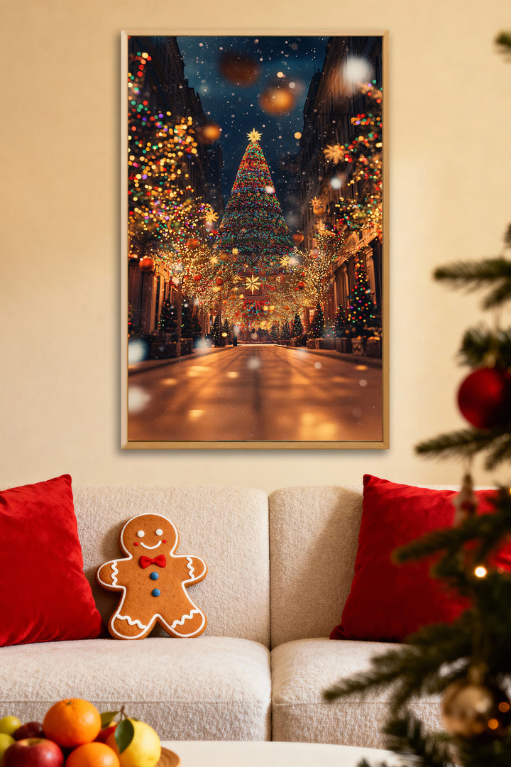 ● 🎇 Majestic Holiday Scene – Towering Christmas tree, festive streets, and golden glow.