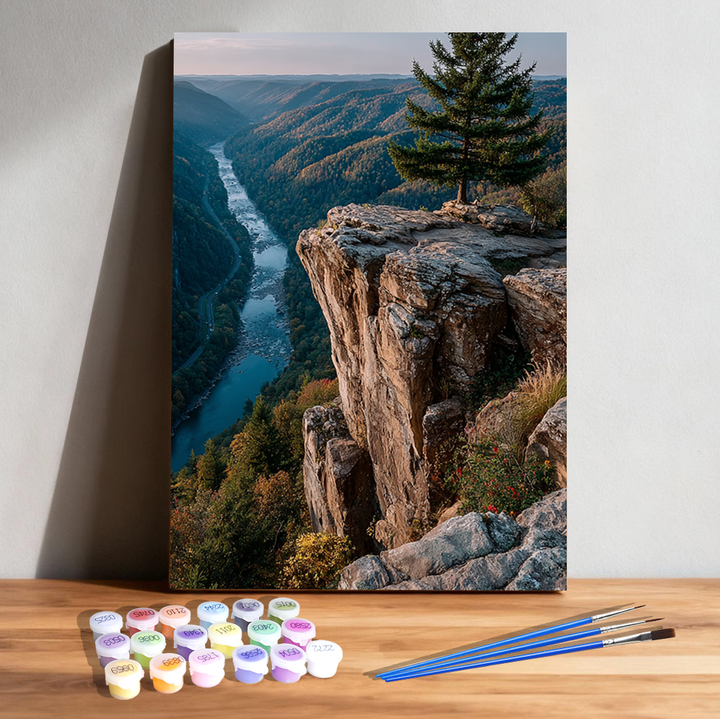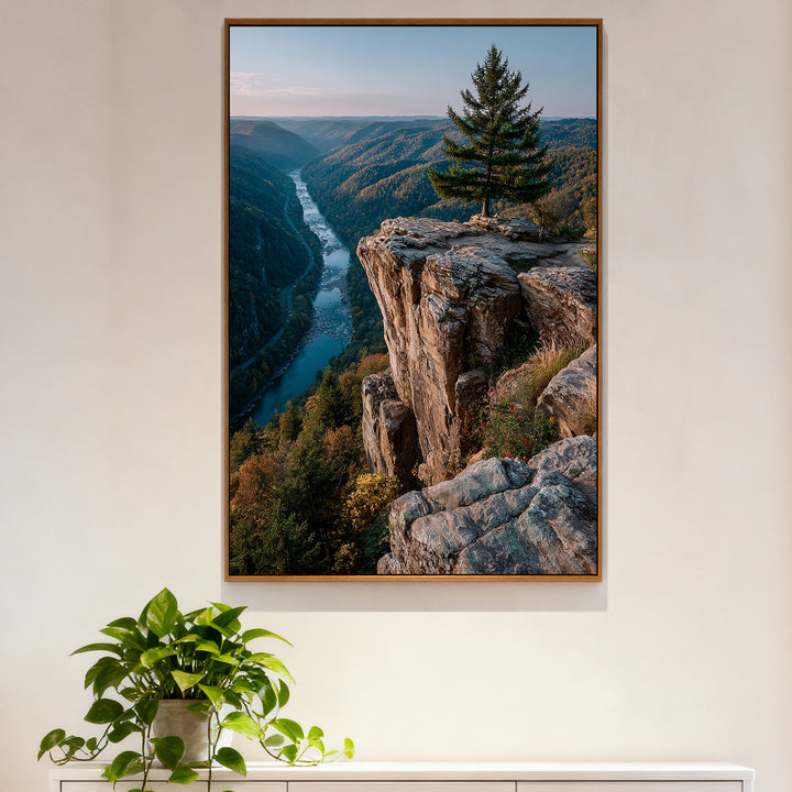 “Summit Lone Pine” captures a breathtaking high-cliff overlook: a solitary pine rooted firmly on ancient stone, watching over a winding blue river and endless autumn forests below.