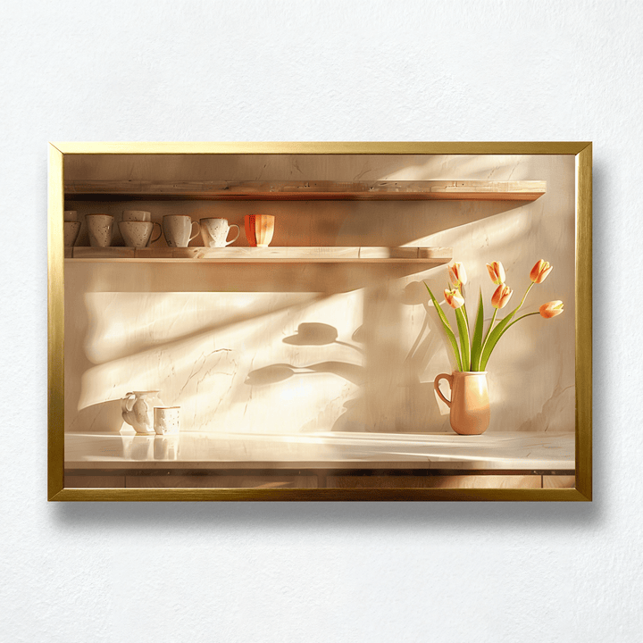 Sunlit Harmony captures a kitchen bathed in golden glow —