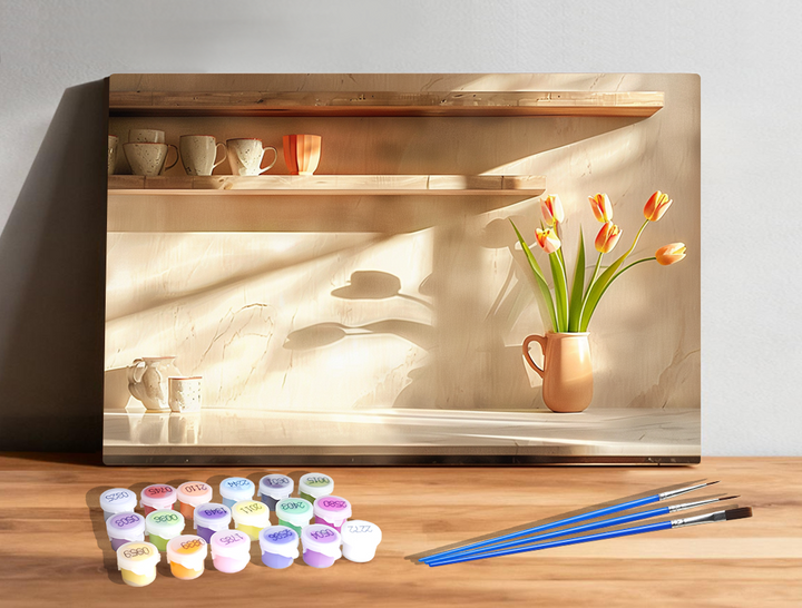 fresh tulips, soft ceramics, and shadows that dance like music.