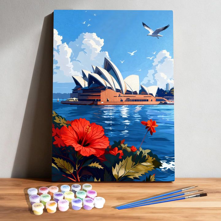 This paint-by-numbers kit features the iconic Sydney Opera House surrounded by clear blue skies, calm waters, and bright tropical blooms in the foreground.